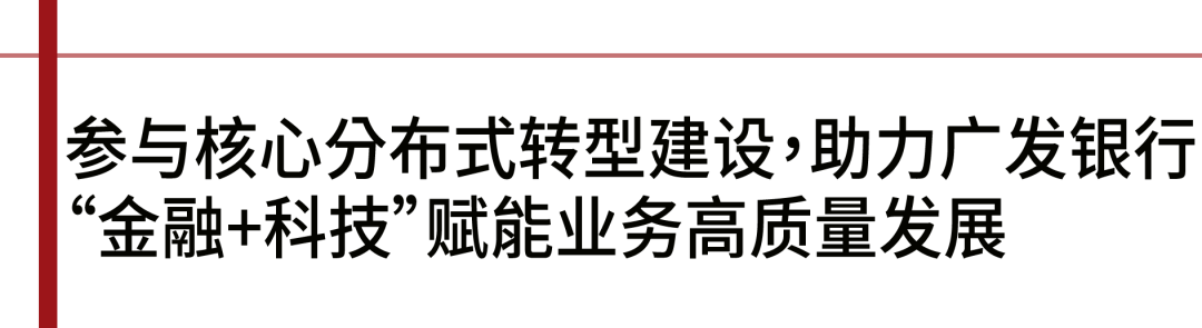 广发银行启动核心系统分布式转型,分步推动主机下移,加速数字化转型步伐,为构建开放金融服务生态奠定基础。广发银行作为全国性股份制商业银行中的科技排头兵,一直走在金融科技探索与实践的前列,以“金融+科技”赋能网点、运营、业务、产品等各方面的数字化创新转型。在统筹发展与安全的大背景下,广发银行围绕“自有技术、自有平台、自有队伍”的转型目标,不断加大对自主技术平台体系建设。