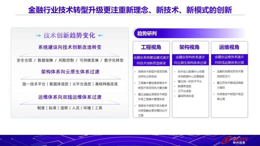 张劲表示,随着数字化转型及信息技术转型升级成为行业共识,监管侧全面构筑技术创新能力要求,产业侧进行着以市场为导向的转变和机构与厂商双向选择的变化,技术侧也呈现出云替换、一云多芯、持续演进、开放生态、安全合规多个发展趋势,白皮书对金融行业技术创新趋势进行了研判,从工程视角,金融业系统建设模式逐步向技术创新改造转变;从架构视角,金融业架构体系逐步向云原生架构系统过度;从运维视角,金融业运维体系逐步向双线运维体系过渡。