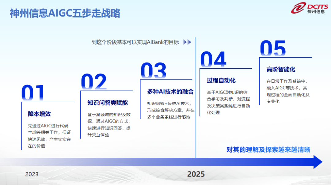 BB贝博艾弗森官网制定了 AIGC 五步走战略,并为此制定了发展路径图:以降本增效为起点,到多种AI技术的融合基本可以实现AI Bank的目标,最终达到高阶智能化和专业化的发展路径。